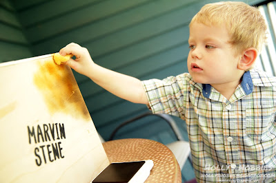 After the box was ready and packed, it was my turn (and Andrew's turn) to help decorate the box. I would suggest maybe decorating the wood pieces first... it was a little inconvenient to stamp upright.