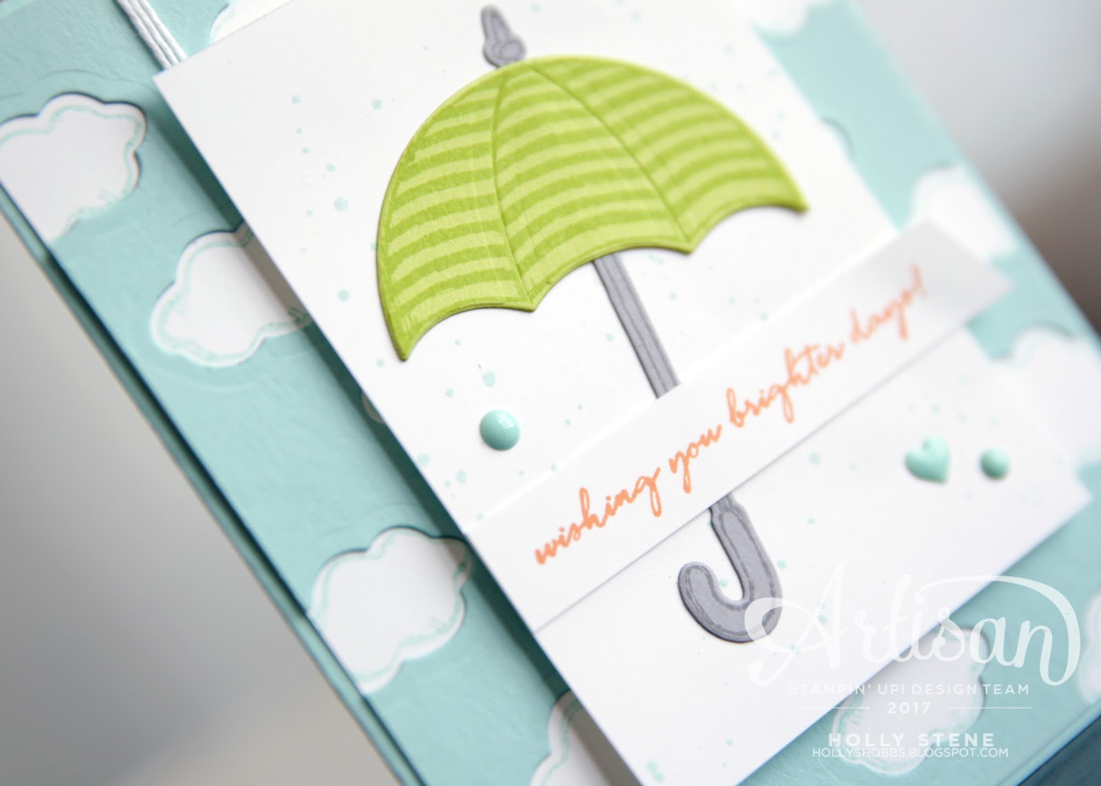 After the paste dried, I added the pretty peach bow with Peekaboo Peach 5/8" Crinkled Seam Binding Ribbon. I really love how this ribbon looks on a card! The umbrella is stamped and diecut again and adhered to a piece of Shimmer White Cardstock. You can see that I added a watercolor wash and splatter to the background as well using an Aqua Painter.